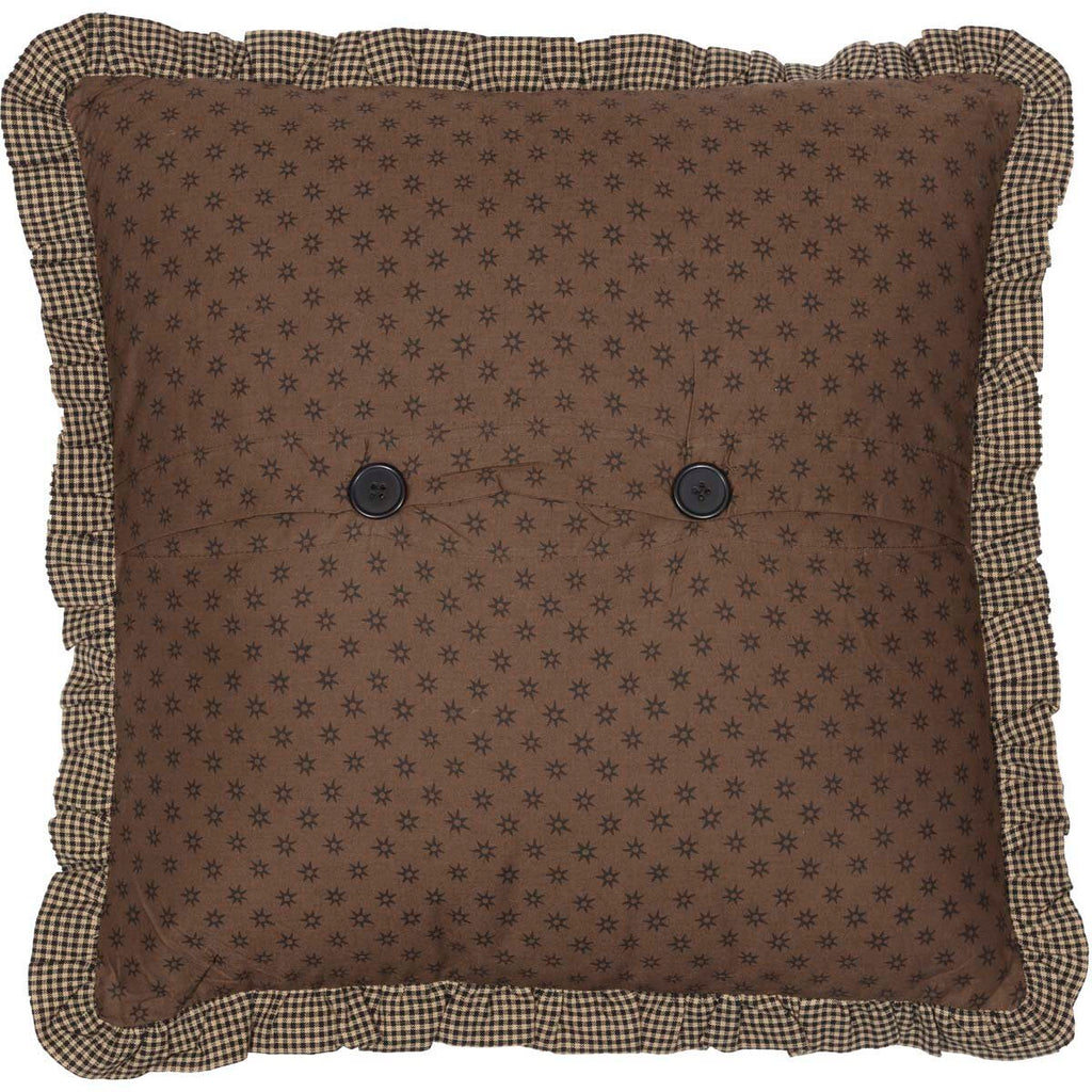 The Bingham Star Fabric Filled Pillow with Applique Stars 16x16 is proud of its primitive charm and displays nine appliqued five point stars on a ground of tan and red windowpane fabric. The pillow is trimmed with a ruffle in black and creme micro check. Reverses to chocolate brown with black ditsy star fabric and a two button closure.