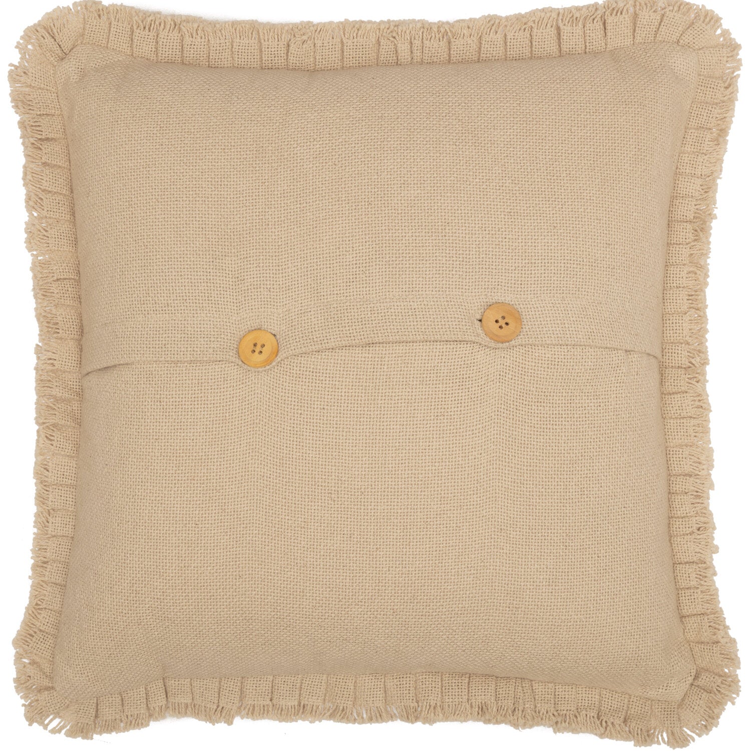 Add a neutral, elegant accent to your living room or bedroom with the Burlap Pillow w/ Fringed Ruffle. Made from our soft cotton burlap, this unique throw pillow has both a fringe and a ruffle that creates vintage interest to an already classy decorative pillow. Place it on a couch, bed, or chair anywhere in your home. The wooden buttons can be displayed at the front to create layered interest or use the solid side for cozy simplicity. Machine washable and iron safe. 100% cotton shell with a dyed polyester lining.