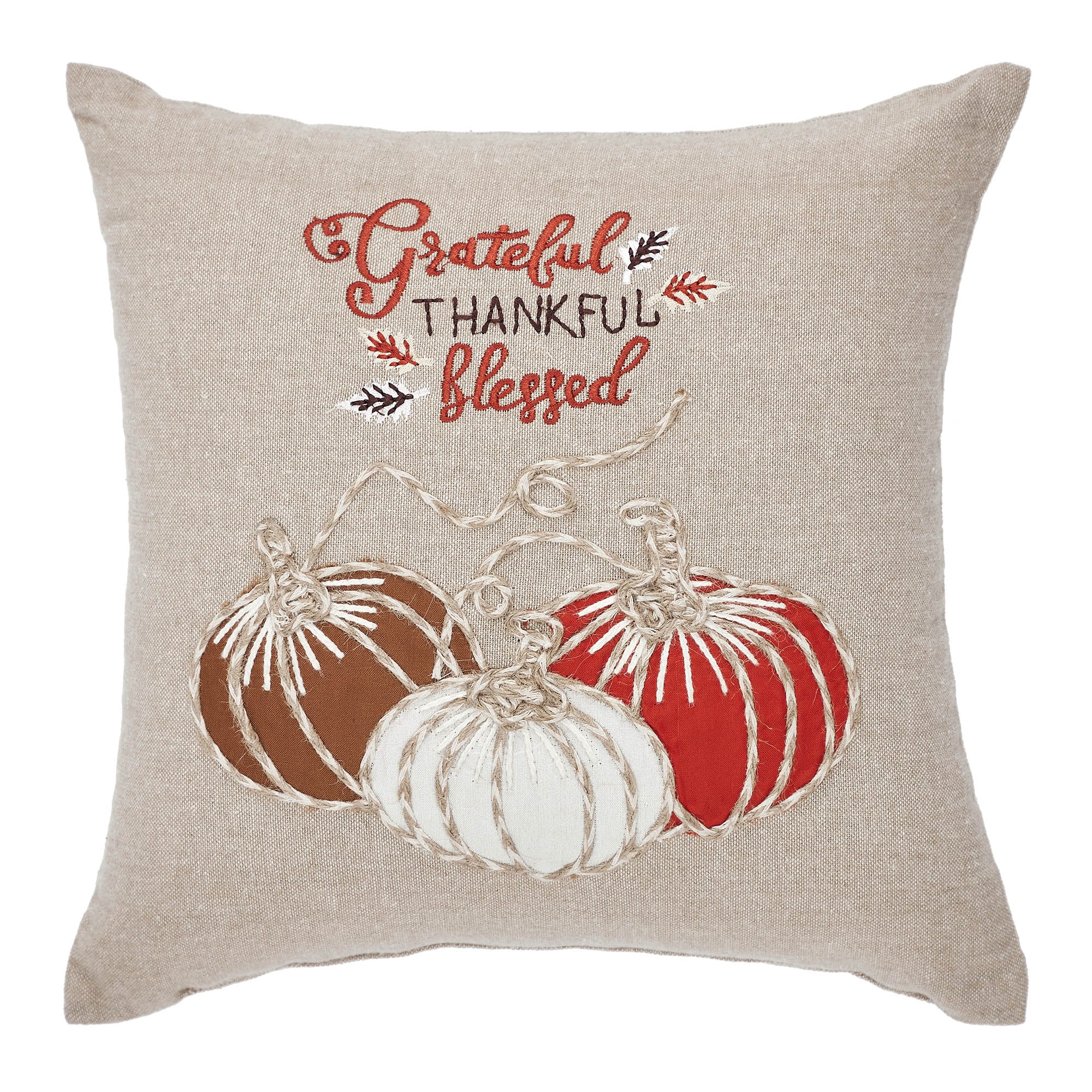 - Featuring an embroidered design showcasing the text Grateful, Thankful, Blessed accompanied by a trio of pumpkins, this pillow embodies the spirit of gratitude and thanksgiving.