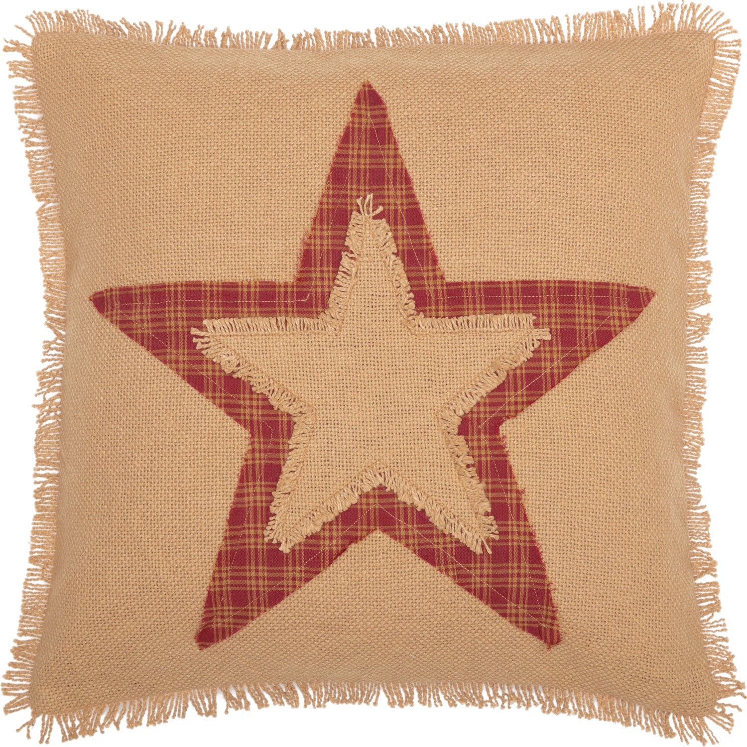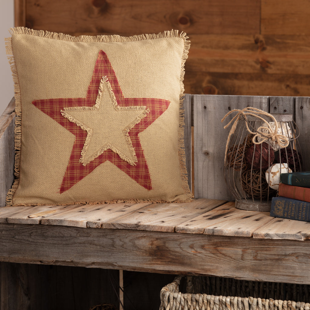 • APPLIQUE STAR: Double-appliqued navy plaid and natural burlap stars with fringed edges