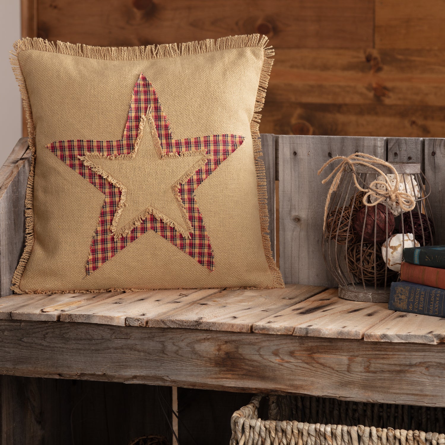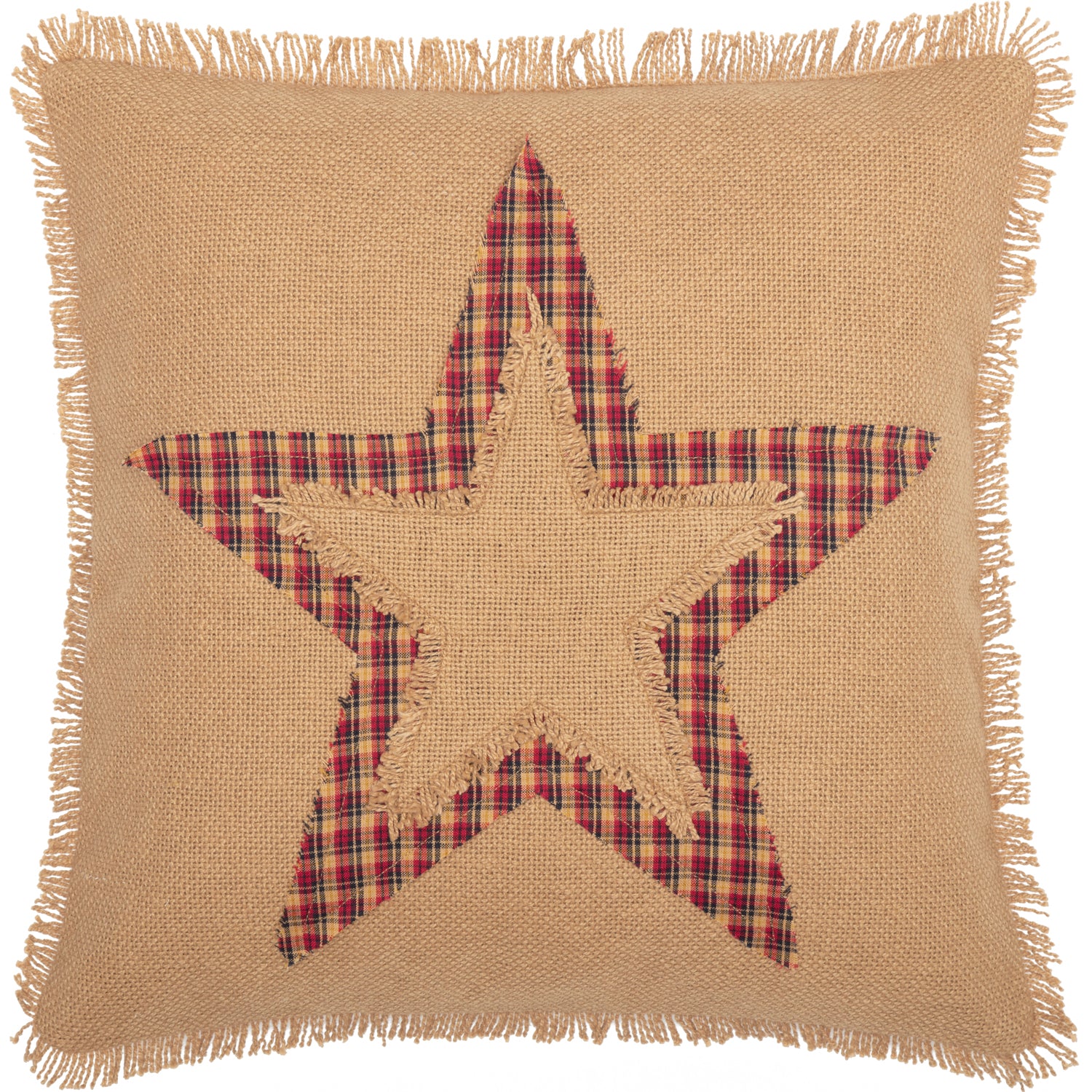 • APPLIQUE STAR: Double-appliqued navy plaid and natural burlap stars with fringed edges