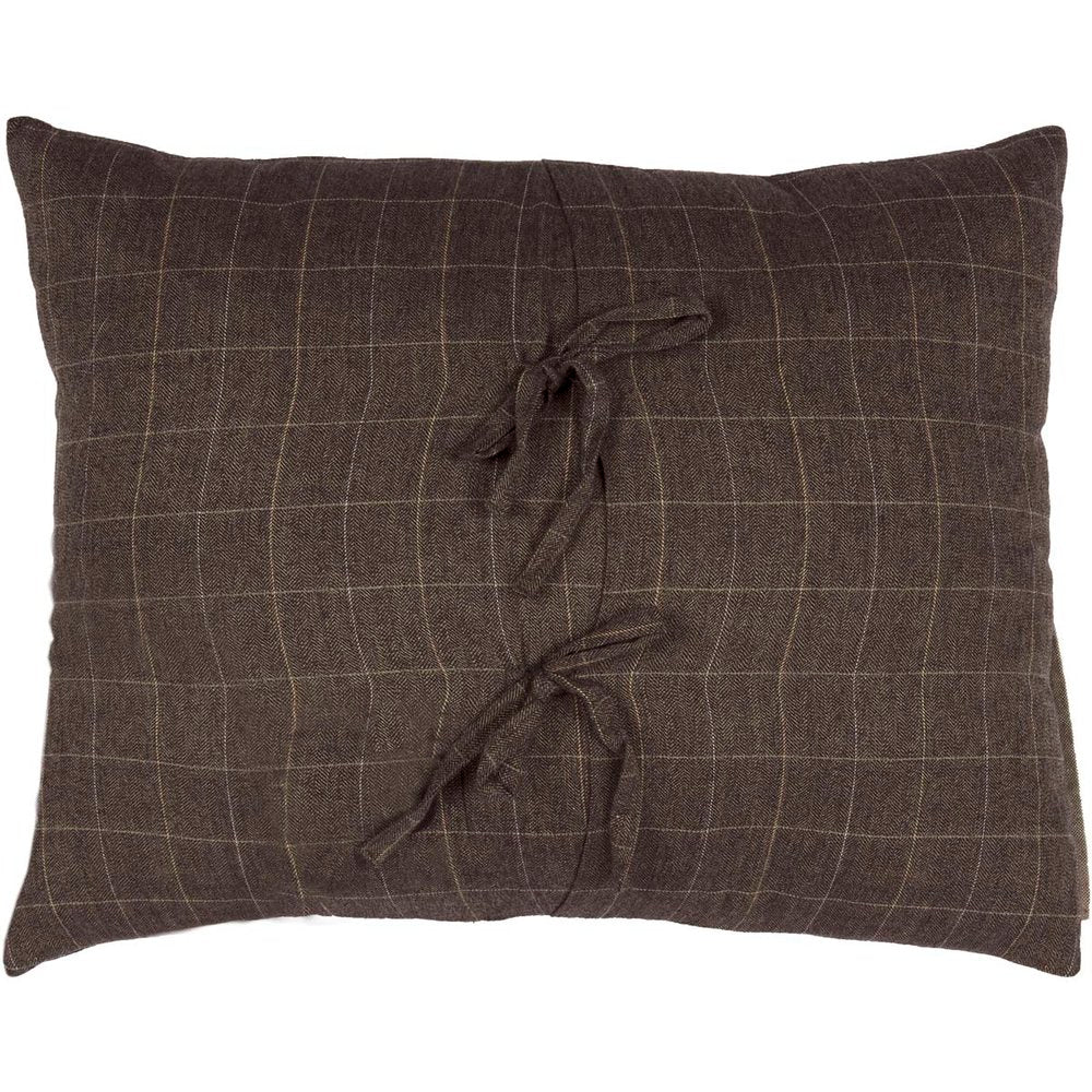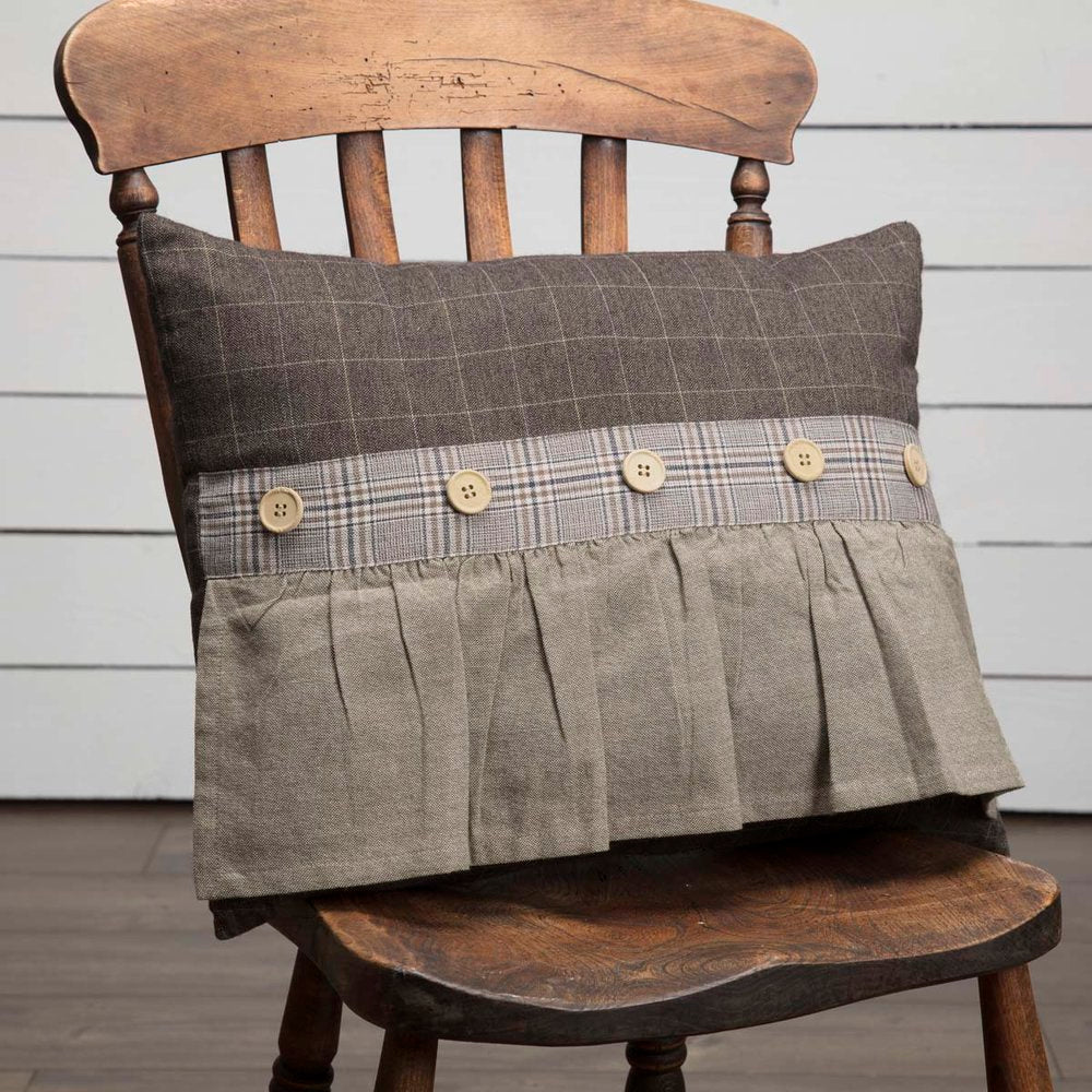 The 14x18 Rory Ruffled Pillow showcases a black and tan herringbone windowpane plaid and greige chambray base. This pillow is finished with a unique gathered ruffle across center for a truly Farmhouse look. Reverses to black and tan herringbone windowpane plaid and 2 tie closures.