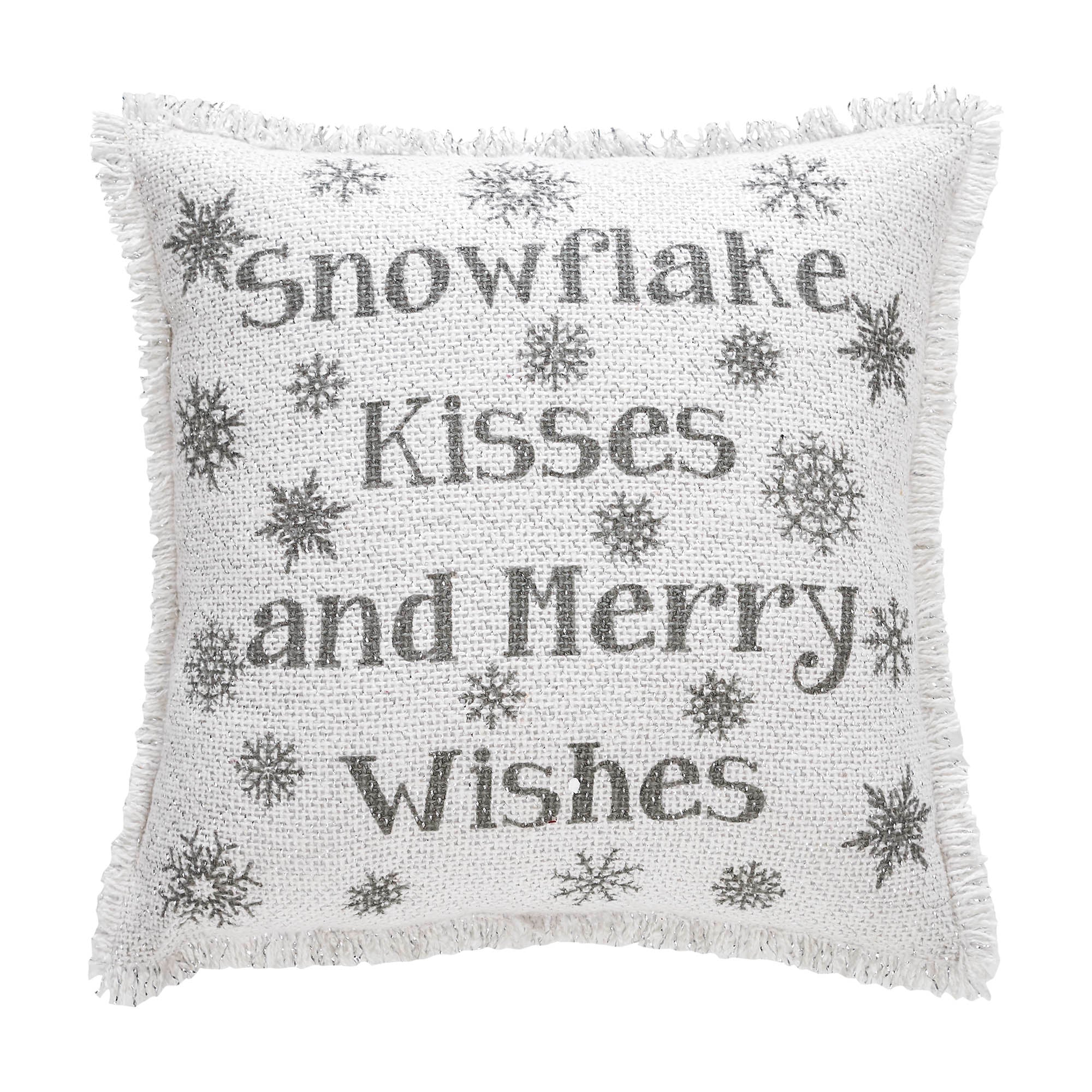 Cute and classy, this festive Christmas accent pillow blends neutral colors and a charming design. The Yuletide Burlap Antique White Pillow measures 12 by 12 inches. The filled pillow features word art reading, Snowflake Kisses and Merry Wishes for a charming farmhouse look with seasonal flair. A sprinkling of snowflakes in dove gray surround the text for a cozy seasonal design. The cozy home accessory reverses to antique white with metallic silver flecks for an elegant farmhouse style while lightly fringed border produces a soft and cheerful look. Spot clean as needed. Coordinates with the Yuletide Burlap Collection by VHC for textured, modern farmhouse style for your whole home.
