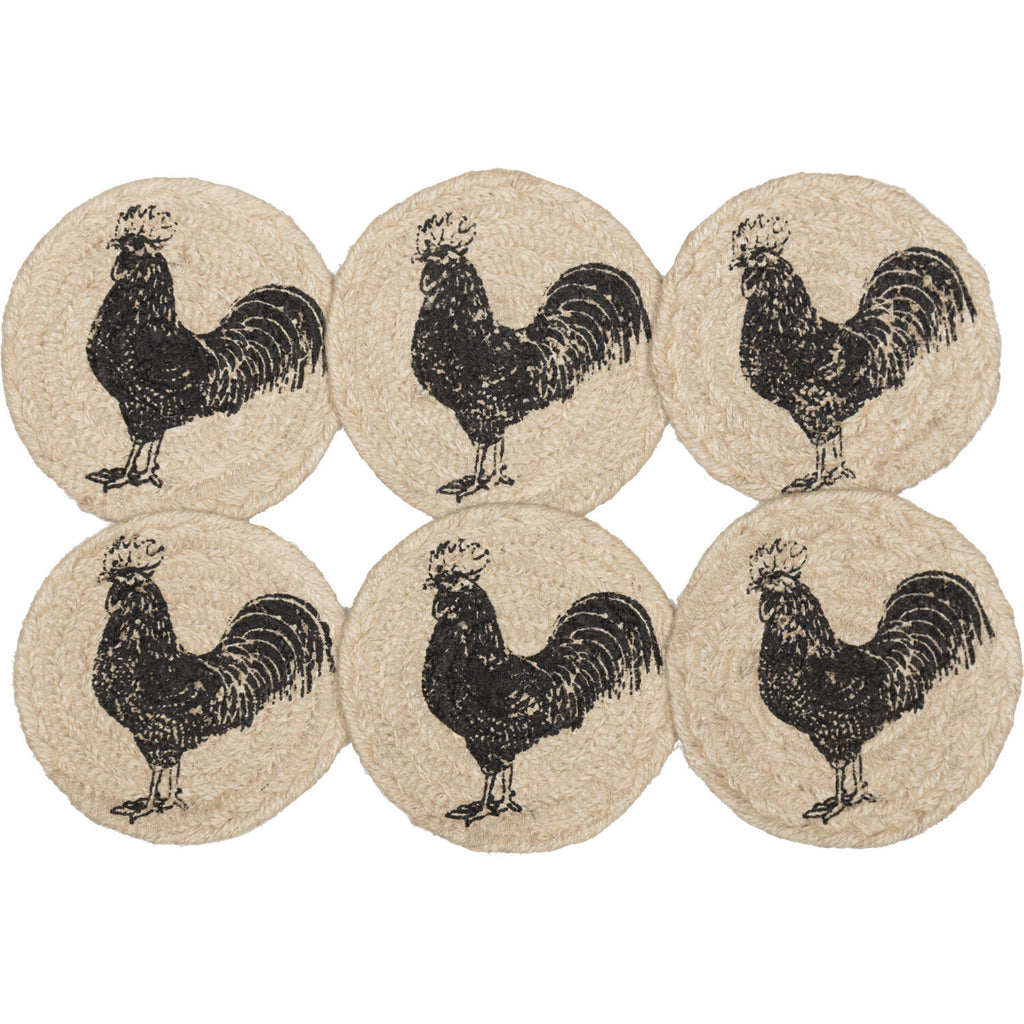 - FARMHOUSE ROOSTER: This drink coaster contains bleached braided jute center accented with black, bleached, silver, and grey taupe braided border, rooster stenciled in center in distressed black