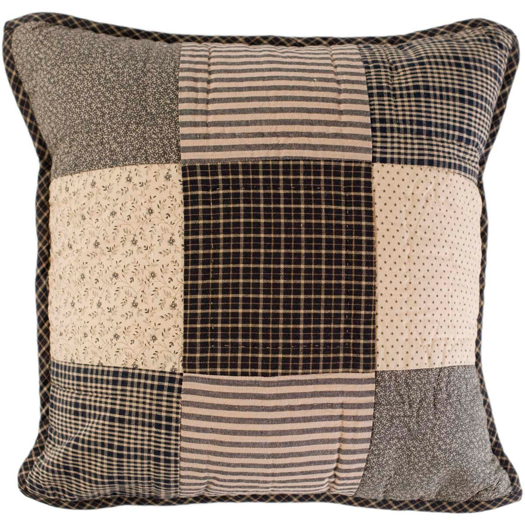 The Kettle Grove Filled Quilted Pillow 16x16 is a patchwork masterpiece with its hand quilting showcasing blocks of black, tan, and dark creme. Reverses to charcoal on a dark creme floral print with two button closures.