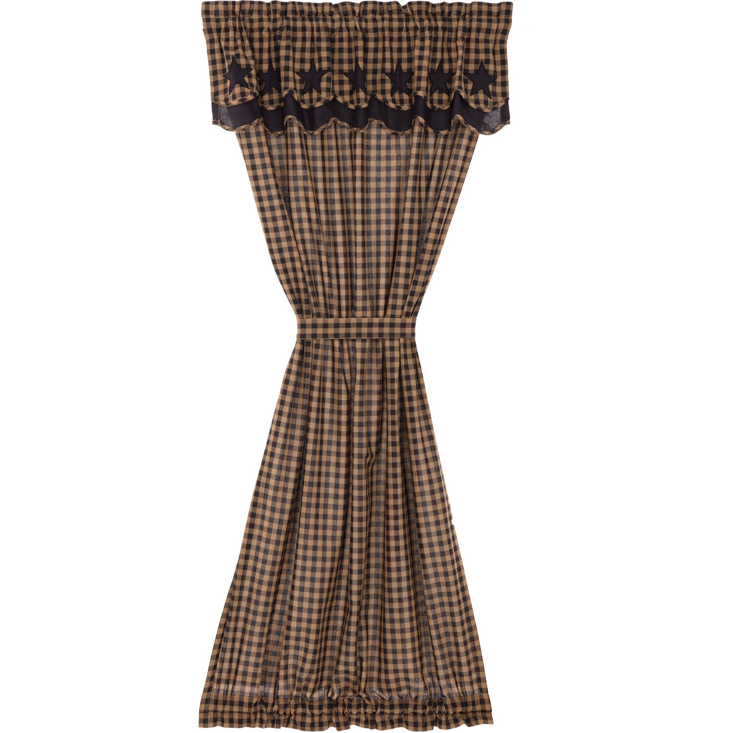 The Black Star Door Panel Curtain with Attached Scalloped Layered Valance is the perfect addition to your country kitchen. Featuring classic check pattern and 5-point stars appliqued in solid fabric along the bottom of the attached layered valance. This country curtain is finished with standard hem fold on each side, with attached scalloped valance on the bottom edge. Includes 1 matching tie back with button for a different look.