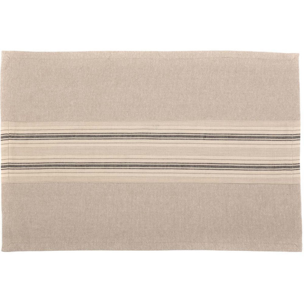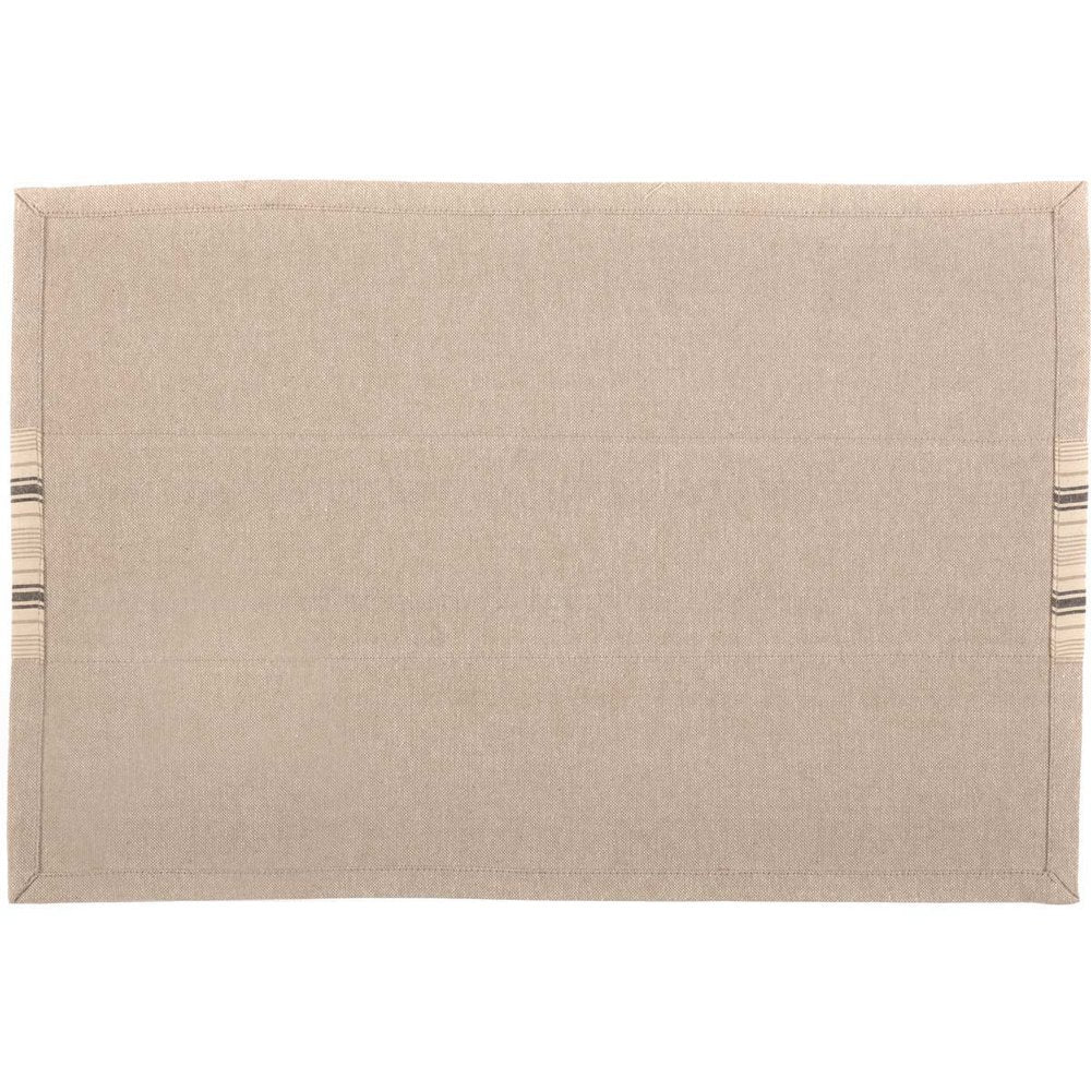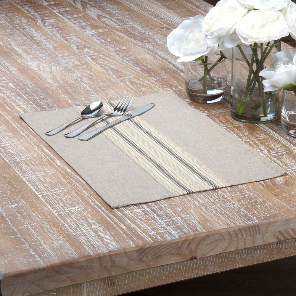 The Sawyer Mill Placemat Set of 6 is a tasteful Farmhouse addition to your home. The dark creme and charcoal grey grain sack striped fabric strip is appliqued horizontally across the center for a timeless addition to your home.