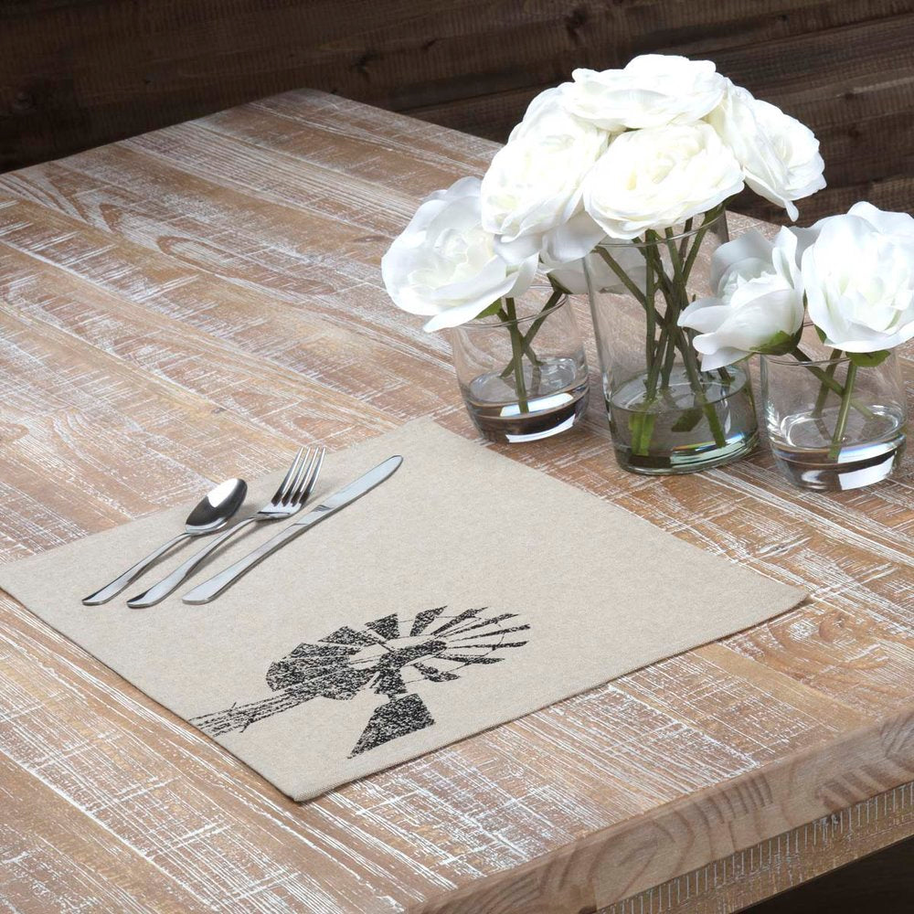 The Sawyer Mill Windmill Placemat Set of 6 is a unique take on Farmhouse with its stenciled black windmill vane over a 100% cotton textured khaki chambray base.