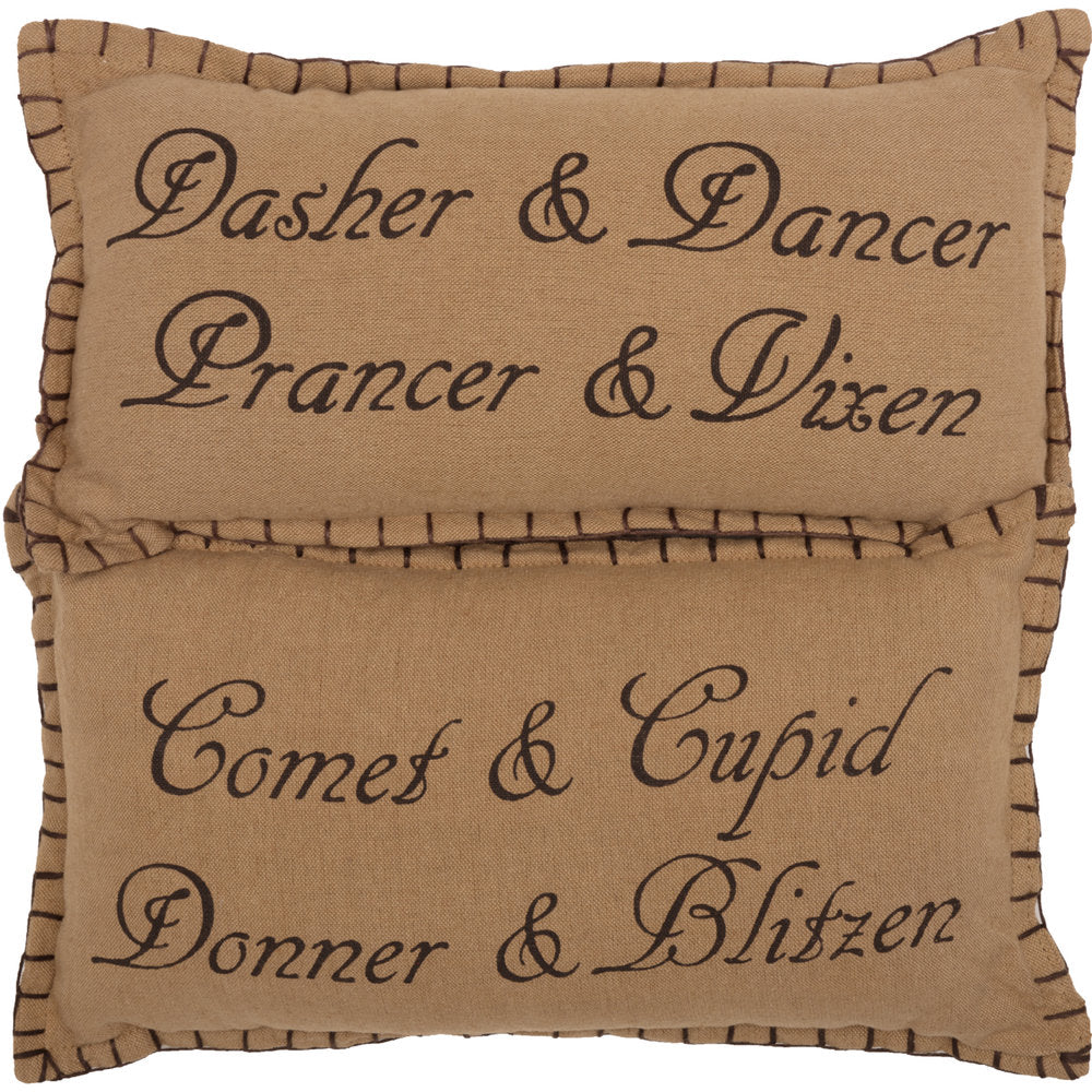 • Features "Dasher & Dancer Prancer & Vixen" in dark brown stenciling on one pillow and "Comet & Cupid Donner & Blitzen" on the other.