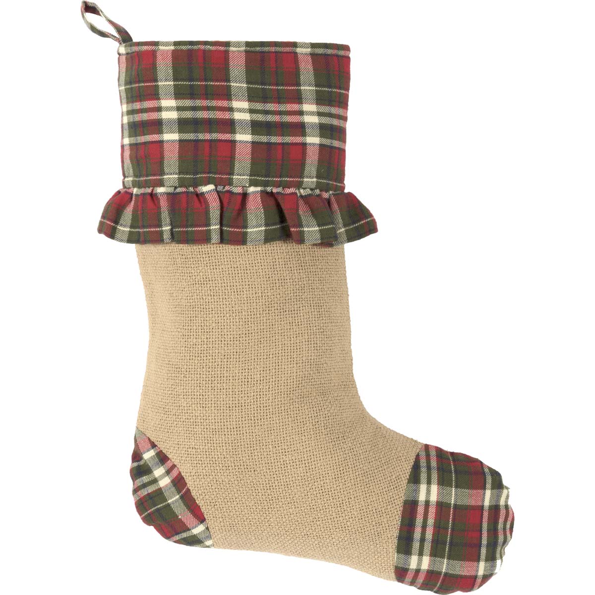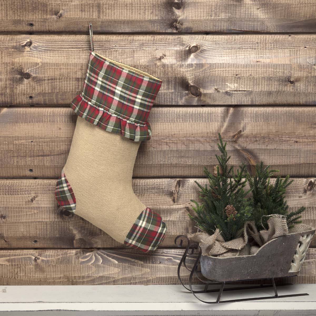 - Cuff, heel, and toe patches in cherry red and forest green plaid fabric