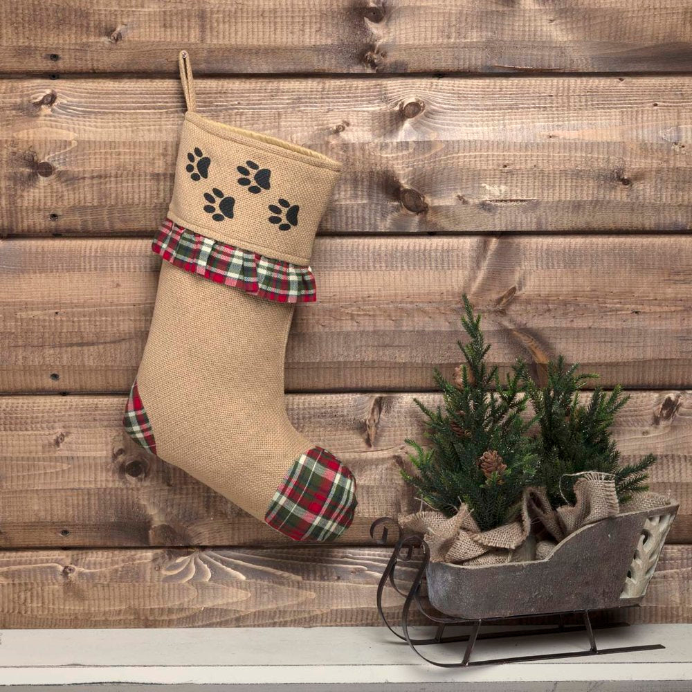 - Natural burlap cotton fabric as cuff and body, cuff accented with stenciled walking paw prints in black