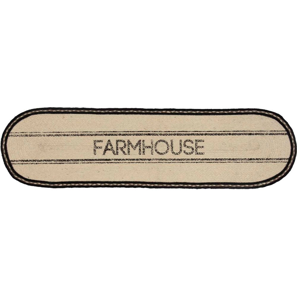 The Sawyer Mill Farmhouse Jute Runner wears its heart on its sleeve. A distressed black stenciled "Farmhouse" is among concentric braids of black, grey taupe, silver, and ivory with a beautiful solid ivory center. Grain sack stripes are displayed above and below the wording.