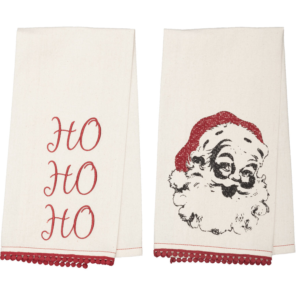 Bring a dash of holiday spirit into your kitchen this year with the Chenille Ho Ho Ho Natural Muslin Tea Towel Set. Featuring a solid antique colored background with beautifully embroidered "Ho Ho Ho" on one towel and a vintage Santa stenciled on the other. Finished with a pom pom lace to add a trendy detail and fun design. Hang this kitchen towel set over the sink or on your oven door handle to add a vintage, whimsical touch to your classic Christmas decor.