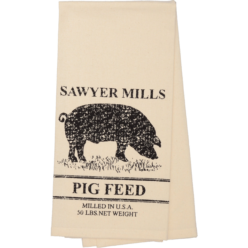 Accent your farmhouse kitchen with the Sawyer Mill Charcoal Pig Muslin Unbleached Natural Tea Towel featuring soft, cotton muslin in antique creme color and a farmhouse pig stenciled in distressed black in the lower section. This casual farmhouse tea towel is accented with feed sack-like details and grain sack stripes and finished with a twill tape loop for easy hanging.