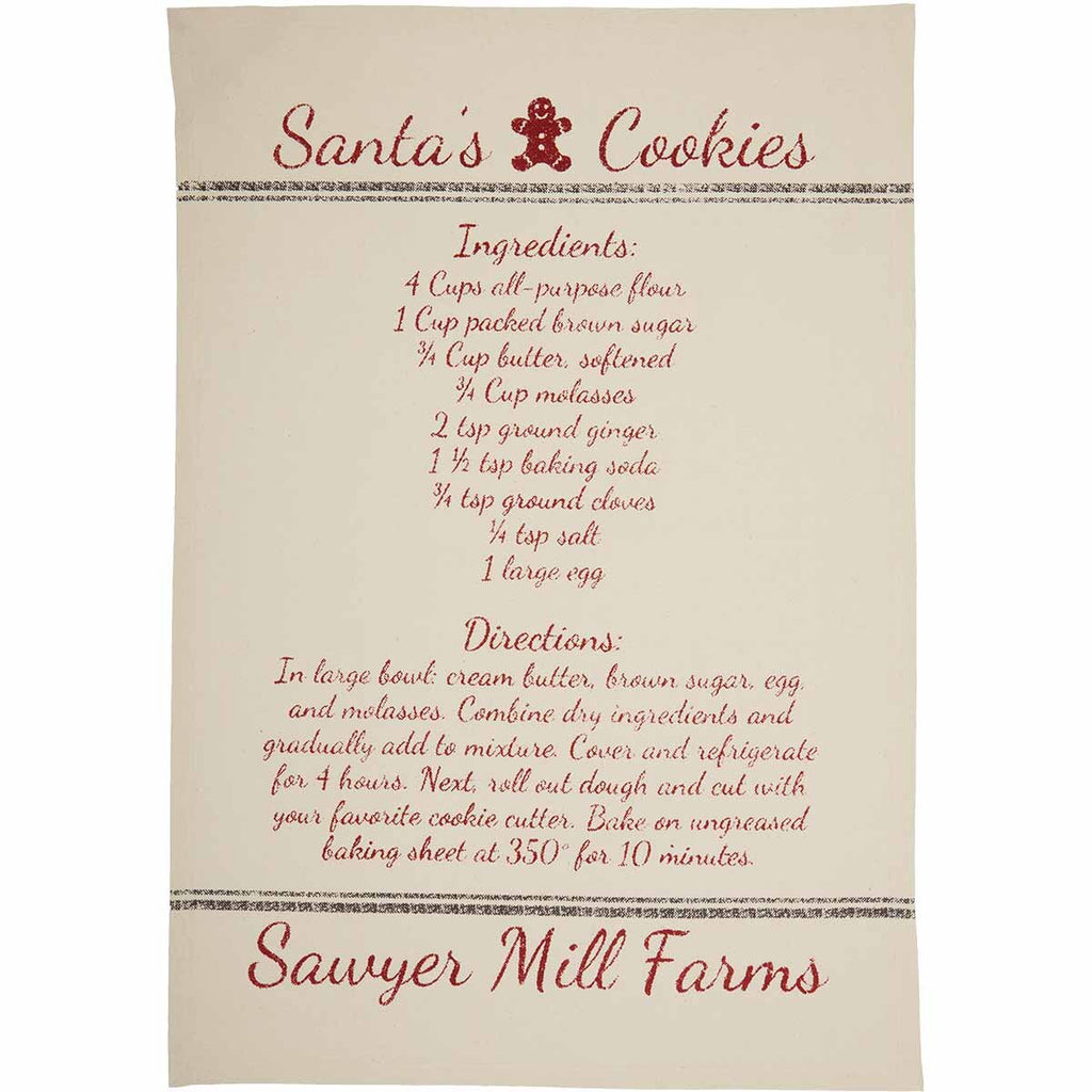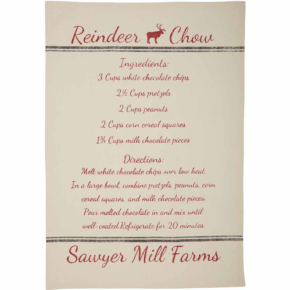 Spice up your farmhouse kitchen decor for the holidays with the Sawyer Mill Holiday Reindeer and Recipes Tea Towel Set. This set of three is made completely from unbleached natural muslin giving it a rough, homespun quality and old time appeal. One of the oldest cotton fabrics to date, unbleached muslin adds historical charm to our tea towels. To further create vintage appeal, all of these tea towels have weathered, distressed lettering. One tea towel depicts an antiqued reindeer, while the other two have recipes for "Reindeer Chow" and "Santa's Cookies". Finished with a fabric loop on the inside of the towel to hang on a decorative hook if desired.