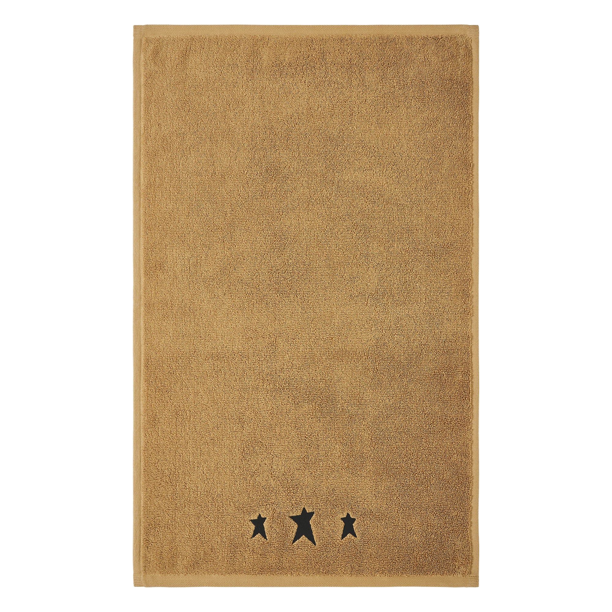Bring a touch of rustic charm to your bathroom with the VHC Brands Black Prim Stars Tan Hand Towel Set of 2. Made from soft and absorbent cotton terrycloth, these hand towels offer both comfort and durability for everyday use. The neutral doe tan hue provides a warm, versatile background, while the embroidered design at the bottom showcases three primitive stars in rustic black, adding a charming, rustic feel to any bathroom decor. Measuring 16x26 inches, these hand towels are the perfect size for hanging near the sink or on a towel bar, offering practicality with a decorative touch. The primitive star design is ideal for creating a cozy and welcoming atmosphere in a rustic or country-style washroom. These towels are machine washable for easy care, making them as functional as they are beautiful. The VHC Brands Black Prim Stars Tan Hand Towel Set combines timeless rustic design with modern functionality. Perfect for adding a primitive flair to your home, these towels offer a stylish yet practical addition to your bathroom, elevating the look of your space with their simple yet striking design.