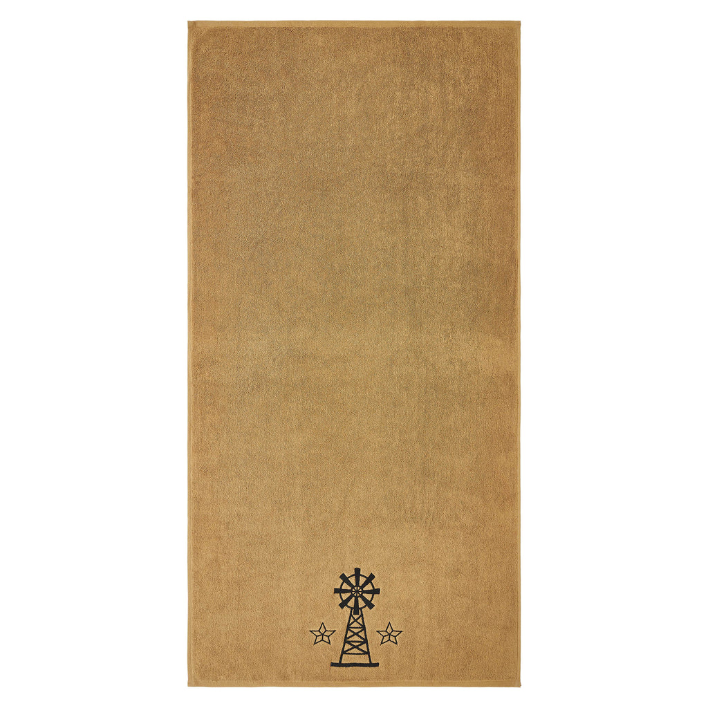 Bring rustic elegance to your bathroom with the VHC Brands Black Windmill & Stars Tan Bath Towel Set of 2. These plush and absorbent cotton terrycloth towels are both soft and durable, perfect for daily use. The neutral doe tan hue provides a warm, earthy tone, while the embroidered design at the bottom features a charming windmill accompanied by black barn stars, adding a touch of country charm to your bathroom decor. Measuring 27x54 inches, these generously sized bath towels are ideal for drying off after a bath or shower. The black windmill and barn star embroidery evoke a homestead feel, making these towels a perfect match for farmhouse or country-style bathrooms. Designed for easy care, these towels are machine washable, ensuring they stay soft and absorbent through frequent use. The VHC Brands Black Windmill & Stars Tan Bath Towel Set combines rustic style with everyday practicality. Whether you're updating your farmhouse-themed bathroom or adding a decorative touch to your washroom, these towels provide both functional use and a cozy, country aesthetic, perfect for those who appreciate farmhouse elegance and timeless design.