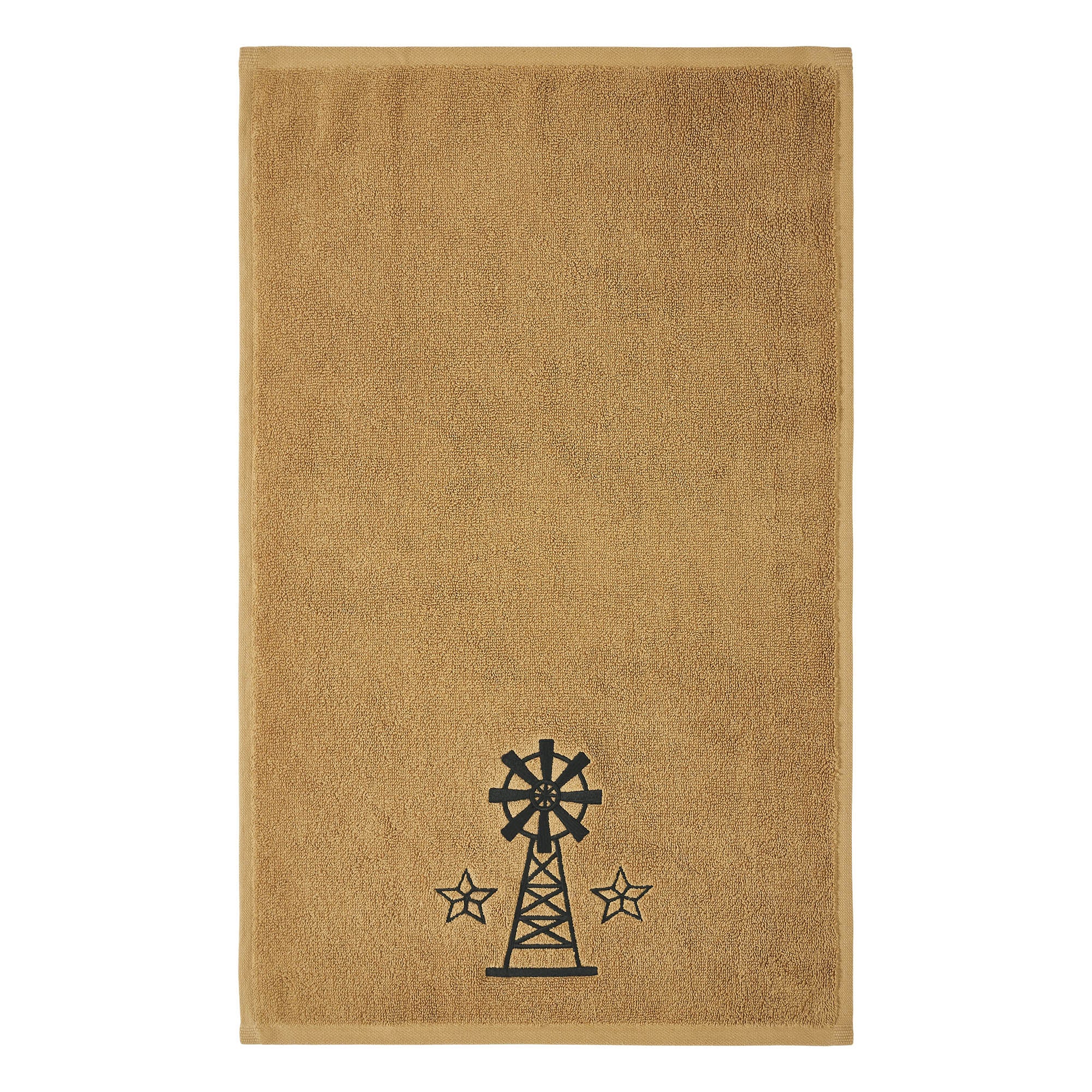 Add a farmhouse touch to your bathroom with the VHC Brands Black Windmill & Stars Tan Hand Towel Set of 2. Crafted from soft and absorbent cotton terrycloth, these towels combine comfort and practicality, perfect for everyday use. The neutral doe tan color provides a warm, inviting background, while the embroidered design at the bottom features a rustic windmill and black barn stars, bringing a country-inspired charm to your bathroom. Measuring 16x26 inches, these hand towels are ideally sized for hanging by the sink or on a towel bar, making them a functional and decorative addition to your bathroom. The embroidered windmill and barn stars enhance the farmhouse aesthetic, creating a homestead feel that fits perfectly in any country-style or rustic washroom. They are machine washable, ensuring easy care and long-lasting durability. With the VHC Brands Black Windmill & Stars Tan Hand Towel Set, you get both style and function. These beautifully embroidered towels bring a touch of rustic elegance to your space, offering a cozy farmhouse vibe while serving as a practical necessity in your bathroom.