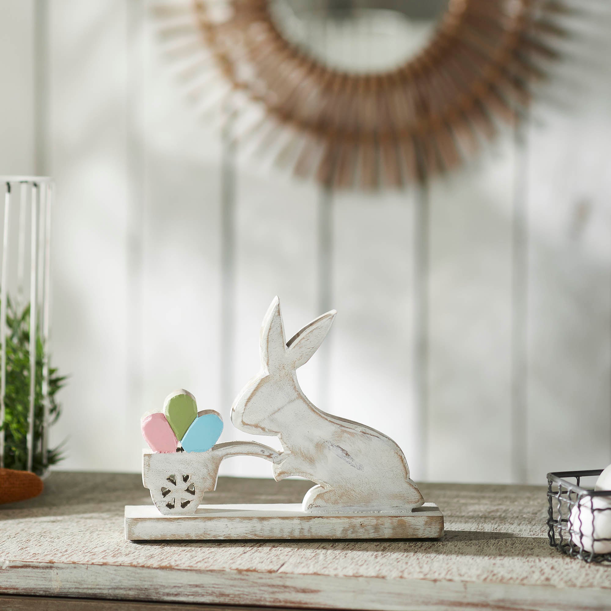 • Charming Easter Figurine: Features a whimsical bunny in distressed whitewash, pushing a wheelbarrow filled with colorful eggs, including turquoise blue, blush pink, and avocado green.