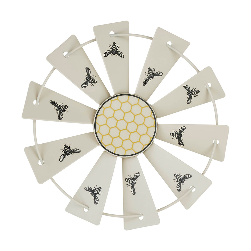 - High-Quality Metal Construction: Made from durable galvanized metal with cream-colored windmill blades, charcoal grey bees, and a soft yellow honeycomb center.