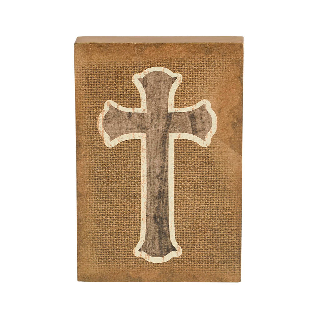 - Elegant Design: Features a natural wooden cross with a white outline against a distressed burlap print background.