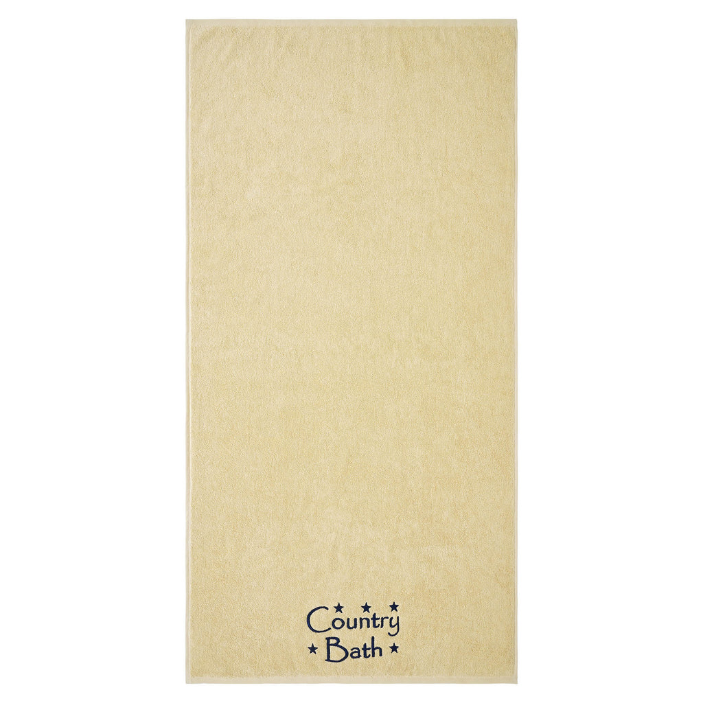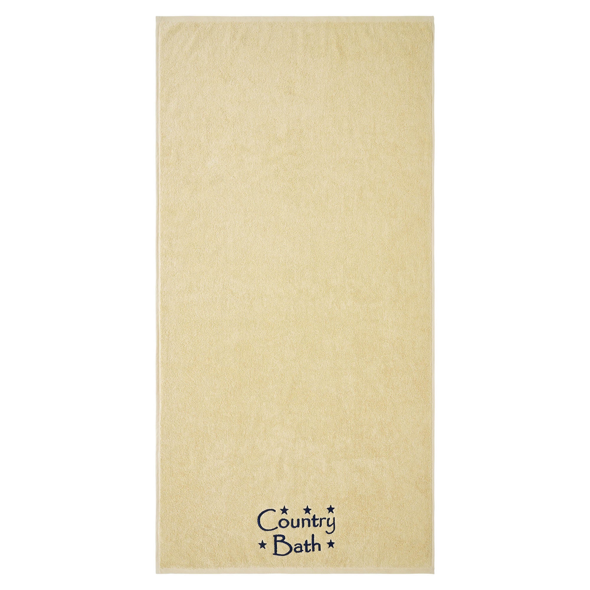 Add a farmhouse touch to your bathroom with the VHC Brands Navy Country Bath Stars Creme Bath Towel Set of 2. These soft and absorbent cotton terrycloth towels are designed for both comfort and practicality. The warm soybean creme color provides a neutral backdrop, while the embroidered design at the bottom features rustic stars encircling the phrase Country Bath in a bold navy blue, adding a charming, country-inspired accent to your bathroom. Each bath towel measures 27x54 inches, offering ample size for daily use after a bath or shower. The embroidered stars and text bring a classic farmhouse aesthetic that complements rustic or country-style decor, making these towels a perfect addition to your country washroom. Machine washable for easy care, these towels are durable and retain their softness after multiple washes. The VHC Brands Navy Country Bath Stars Creme Bath Towel Set combines style and function, offering a cozy farmhouse vibe while serving as a practical necessity. These towels are ideal for those who love blending rustic charm with everyday utility, making them a perfect addition to any bathroom that embraces country living.
