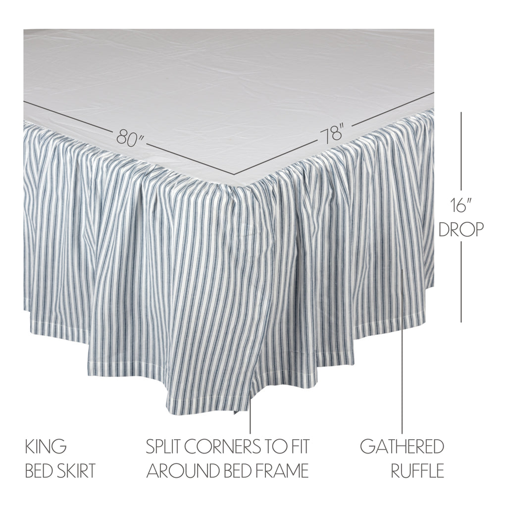 Capture classic farmhouse style with neutral colors and timeless patterns. The Sawyer Mill Blue Ticking Stripe King Bedskirt 78x80x16 completes the look of your modern country farmhouse bedding with deep denim blue and cotton white stripes in a traditional ticking stripe pattern. This cotton dust ruffle is the perfect blend of practical and stylish. Features a long 16-inch drop to ensure that the fabric reaches your floor for a neat, put-together look that blocks under-bed storage from view while also keeping dust out of hard-to-reach area.  These bedskirts are also designed with split corners and slight ruffling for less fuss and a great fit every time. Coordinates with the Sawyer Mill Collection for a complete modern farmhouse look for your bedroom featuring soft plaids and clean stripes in neutral, easy-to-match colors. Machine washable and iron safe.